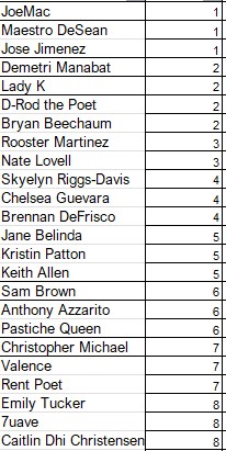 All poets experience 2 nights of preliminary competition (Friday, March 20th & Saturday, March 21st) with 3 Early Bouts and 3 Late Bouts per night.