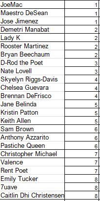 All poets experience 2 nights of preliminary competition (Friday, March 20th & Saturday, March 21st) with 3 Early Bouts and 3 Late Bouts per night.
